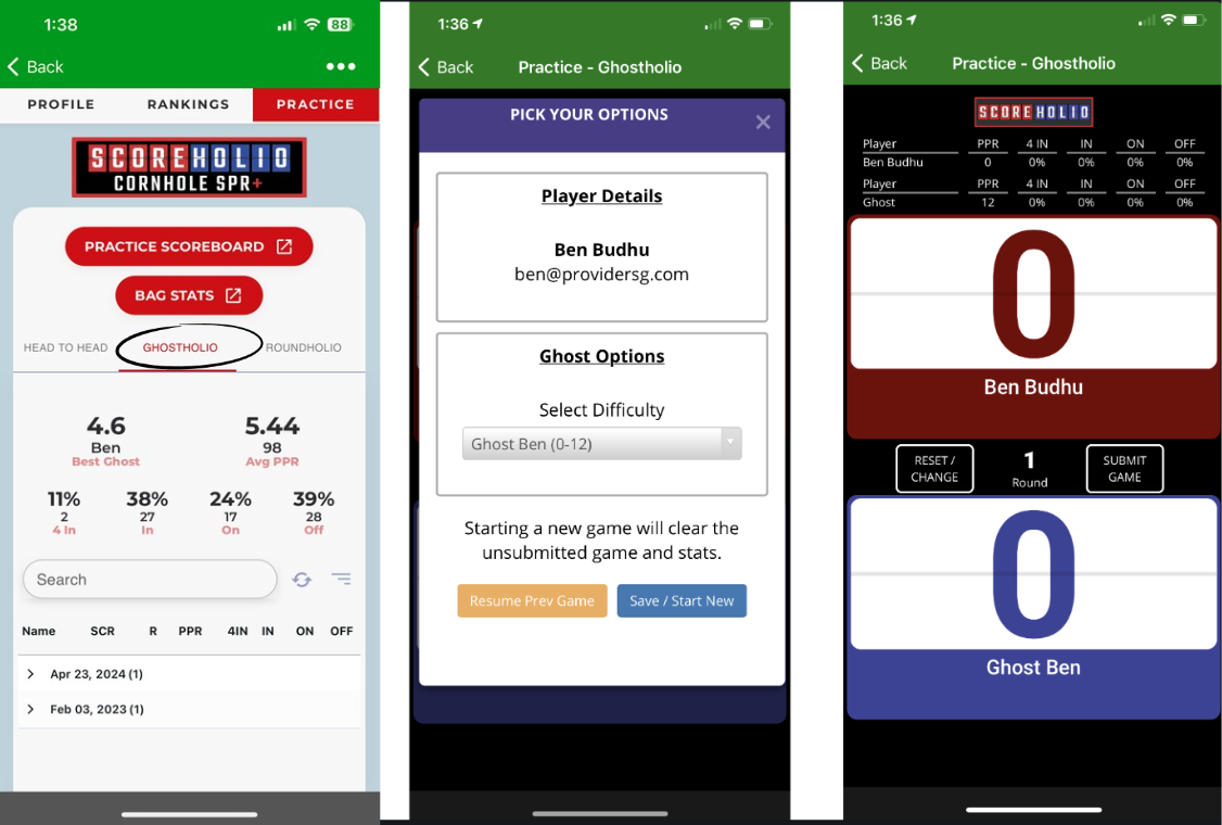Ghostholio is a practice format where you are playing against an invisible opponent. You throw your 4 bags against a "ghost" and score against the ghost like you normally would. Scoreholio has different scoring options for the ghost. \