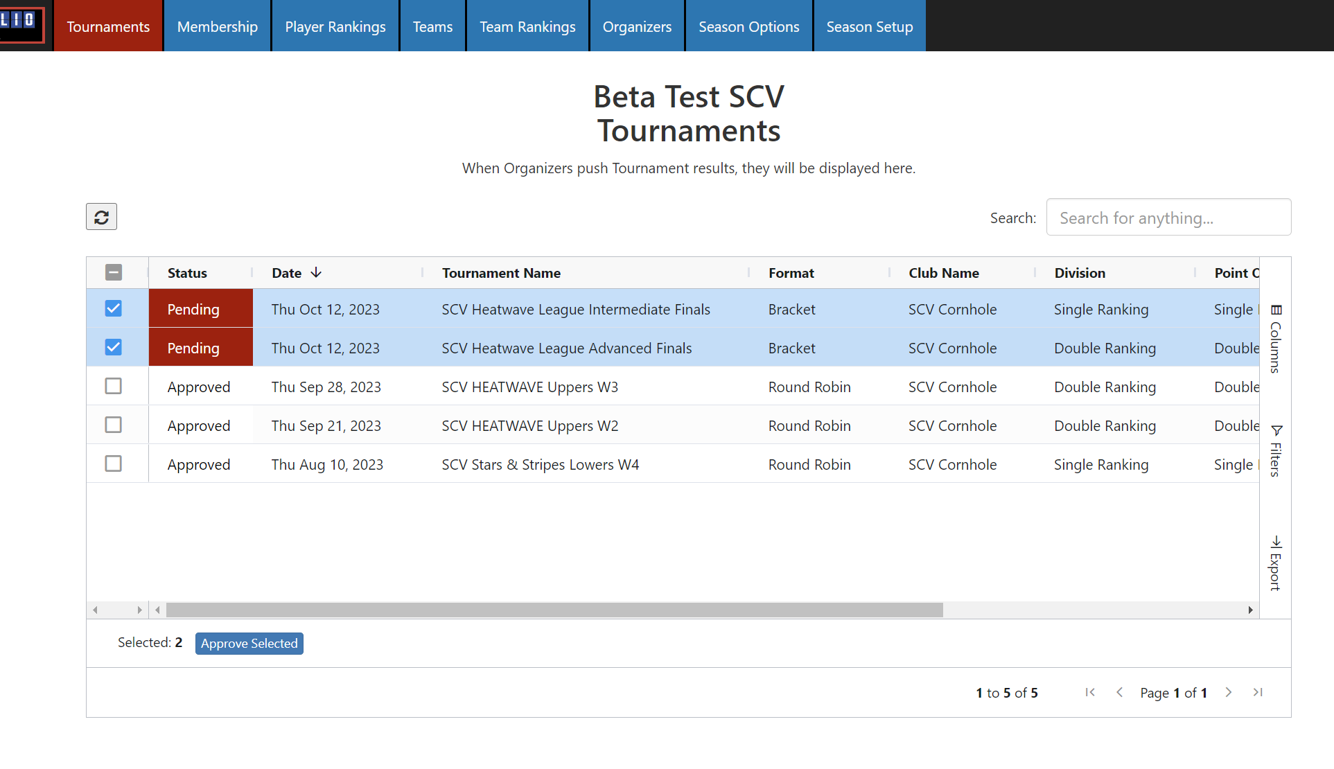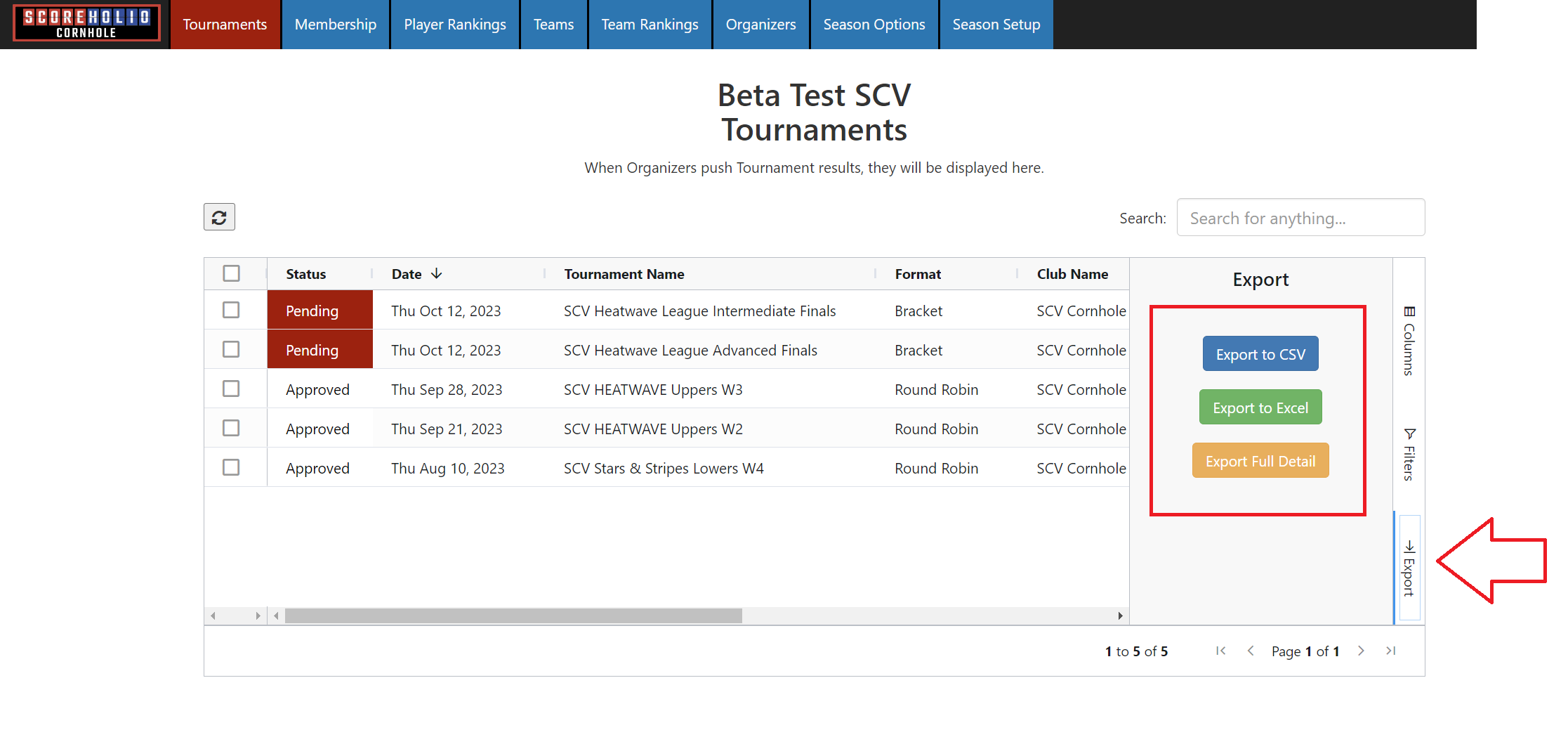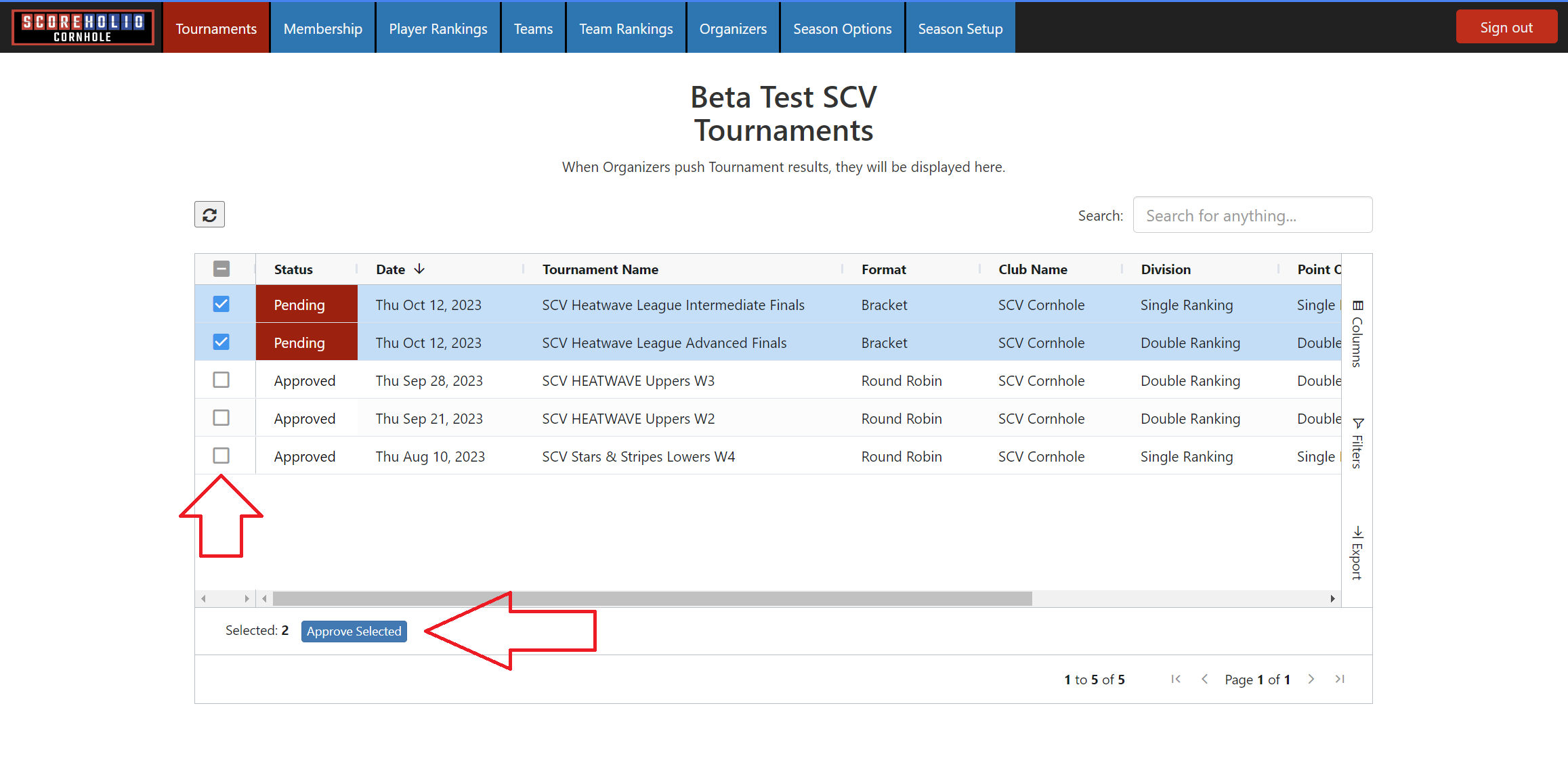 After tournaments are completed your invited organizers can submit the tournament results to your Scoreholio Season. Those tournaments will come in as "Pending" and wait for your approval.&#x20;