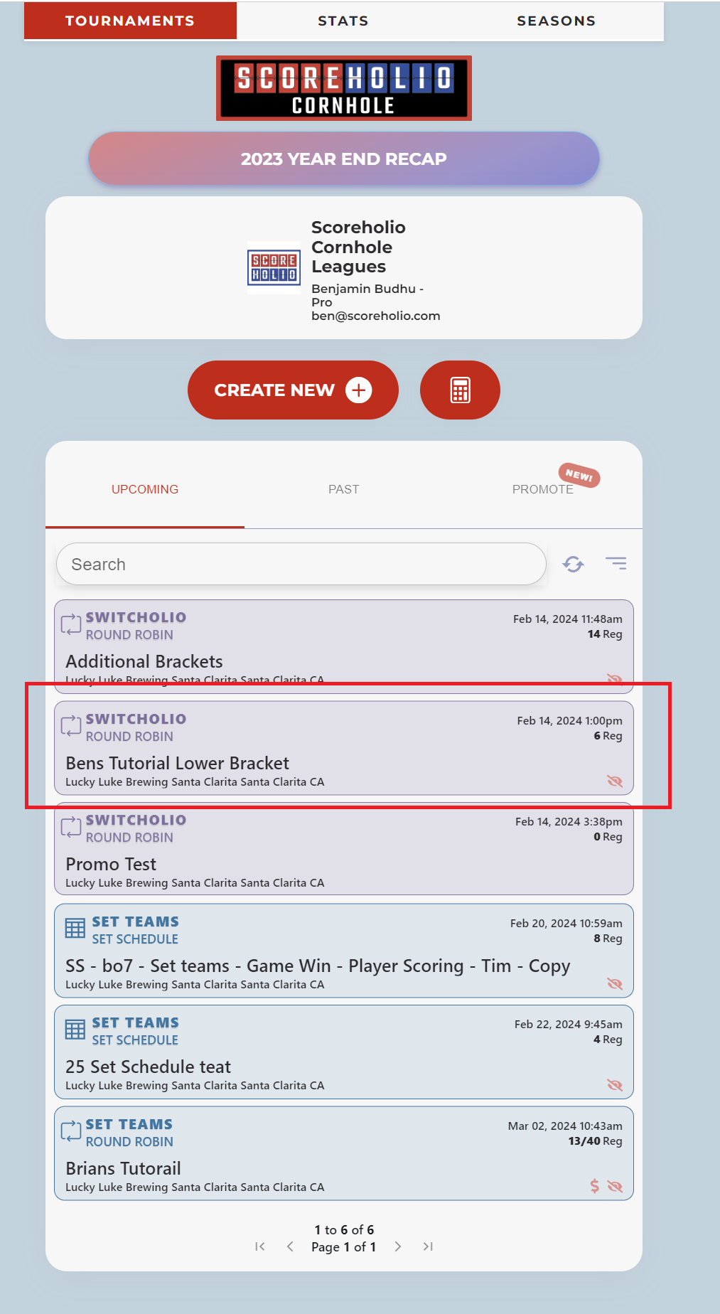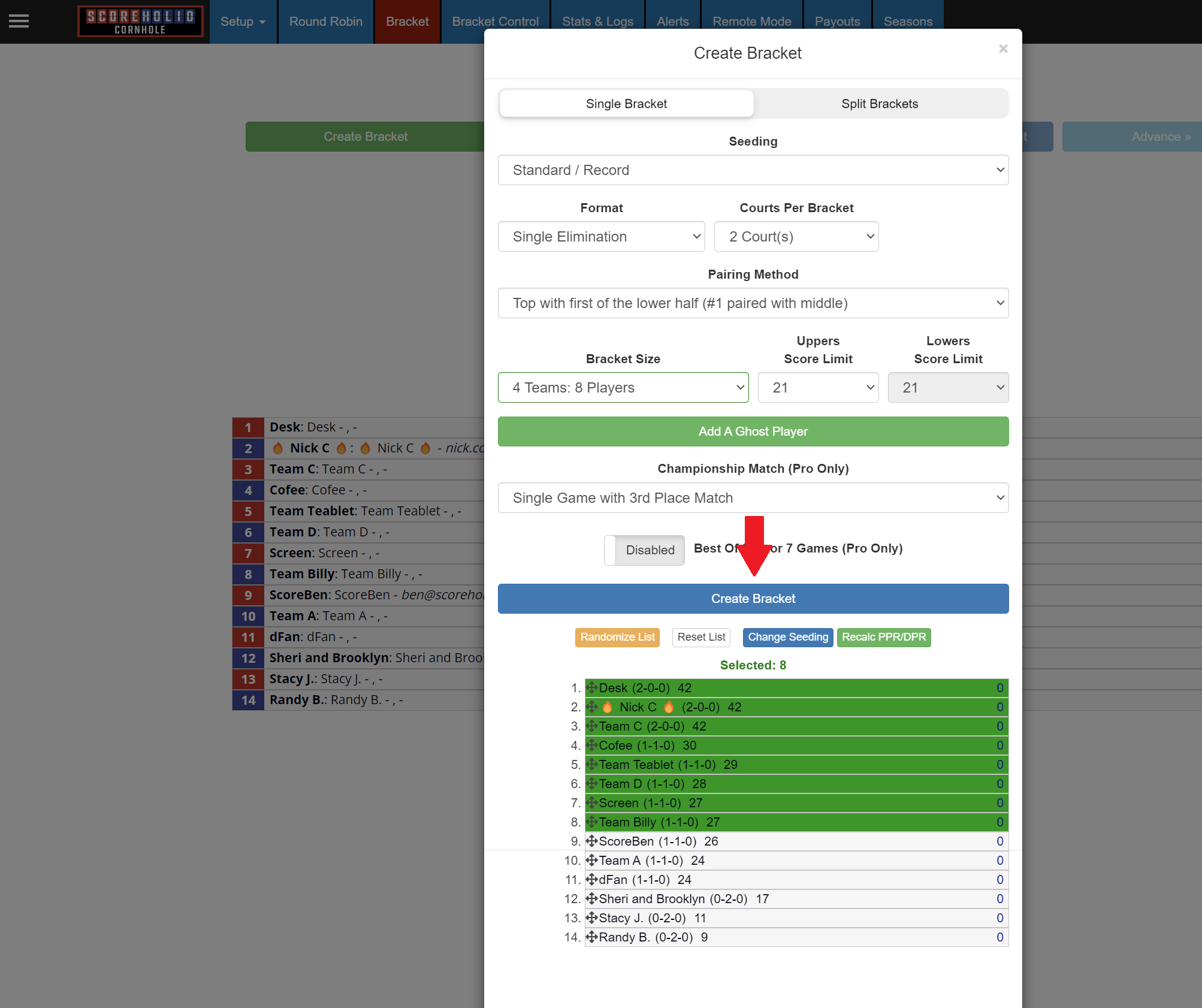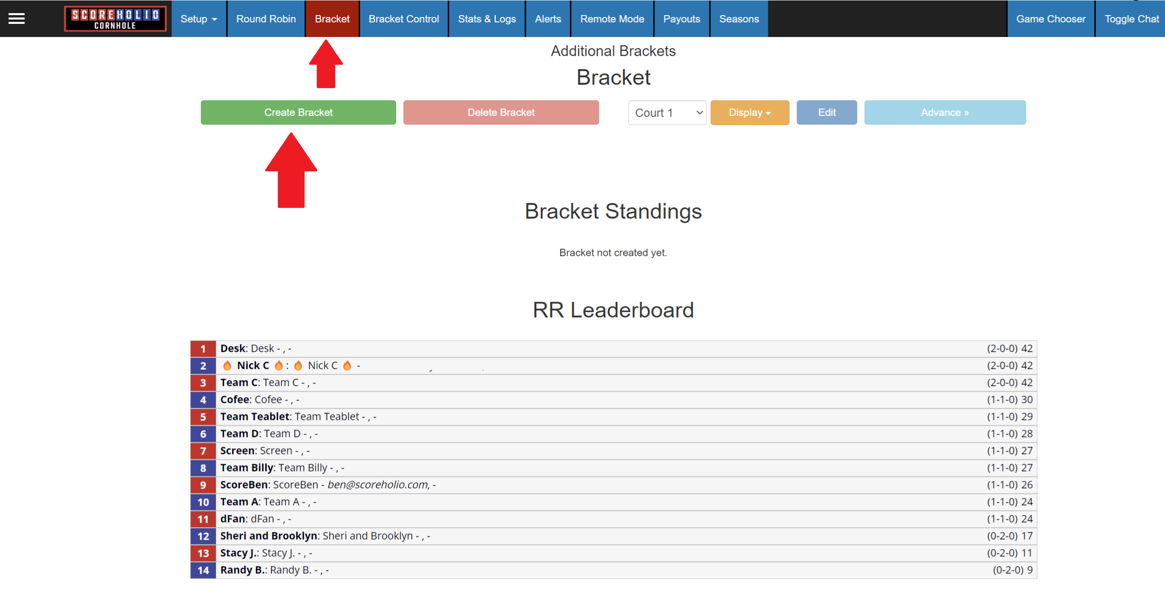 After you are done with your round robin you will click the bracket tab then the green create bracket button:<br>