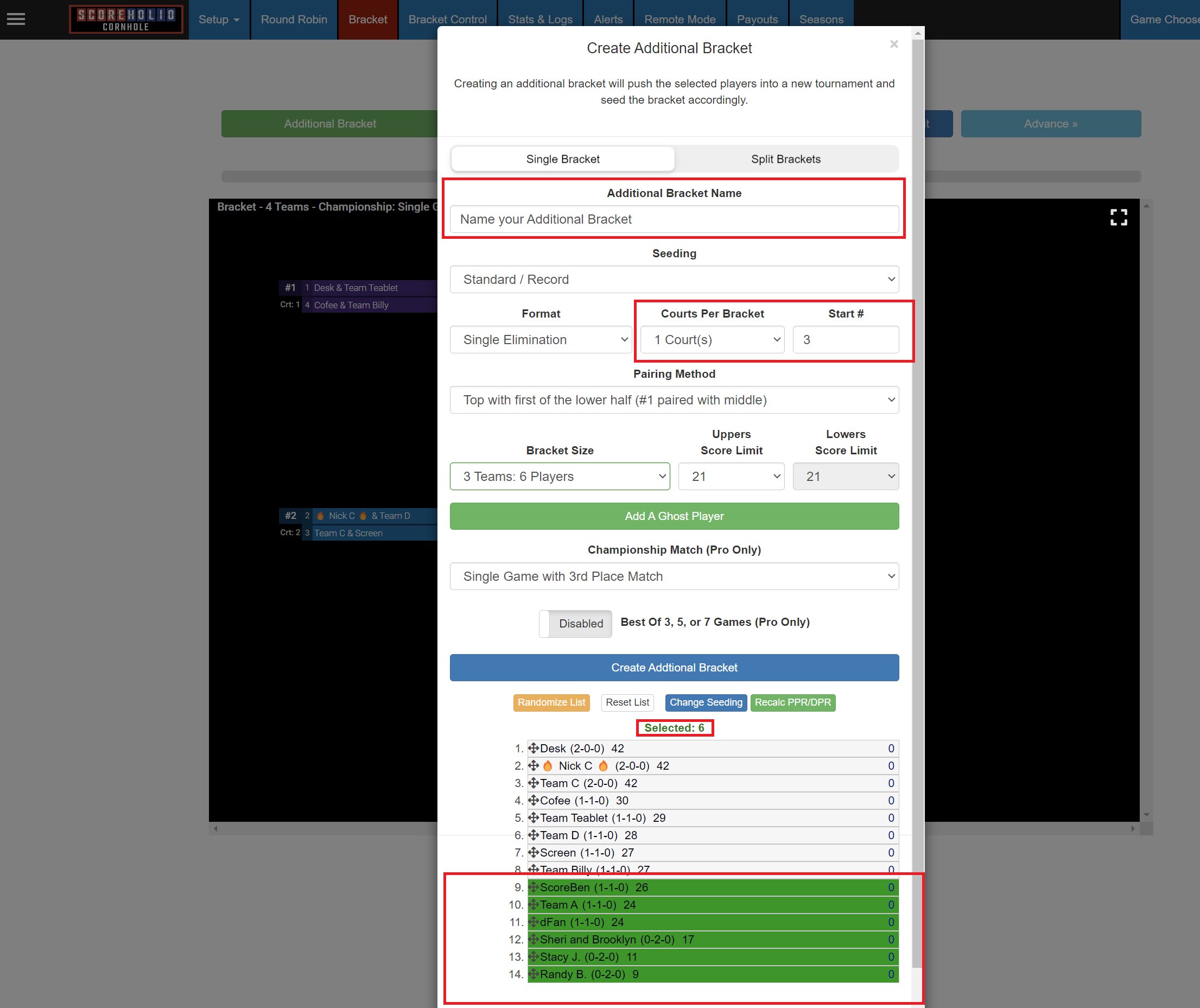 4. Highlight the players/teams you want to go into the additional bracket<br>