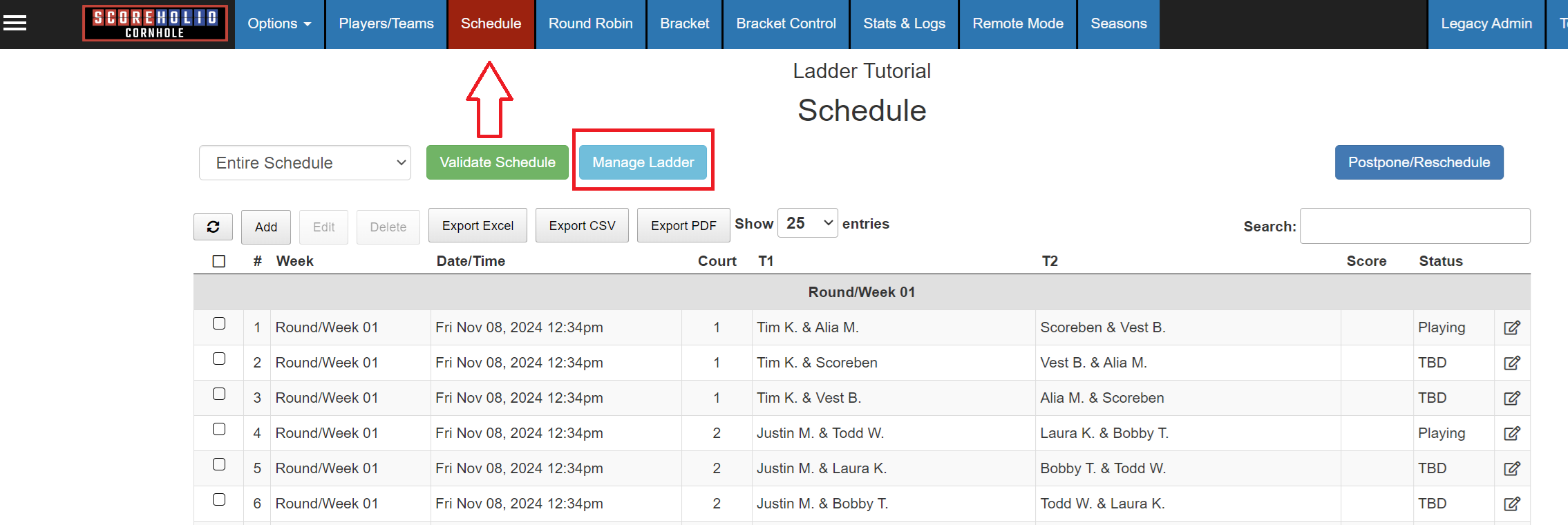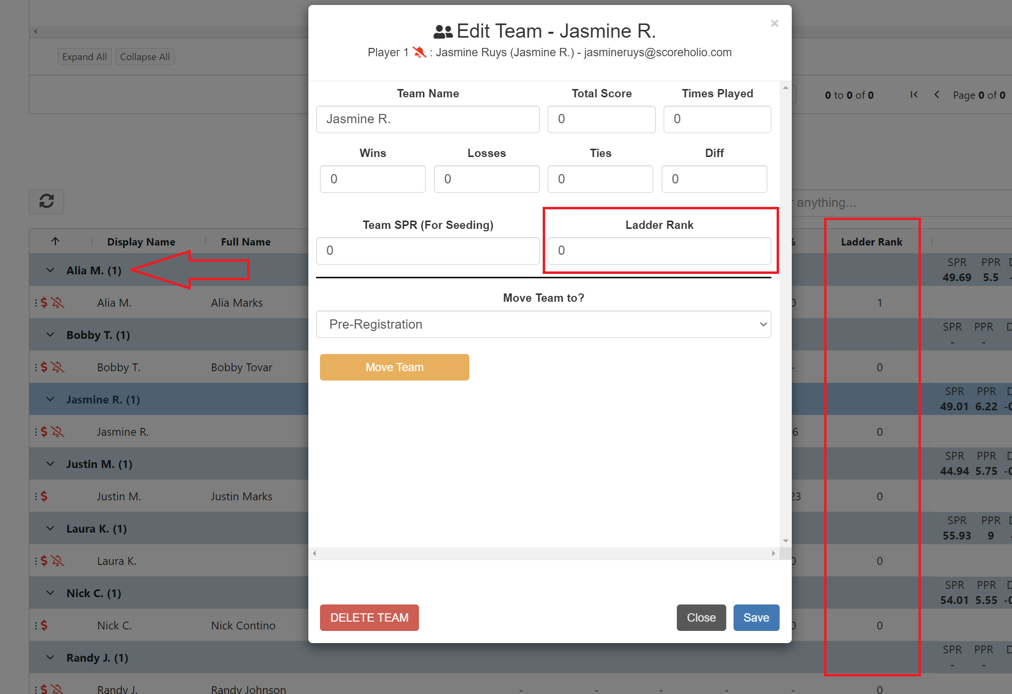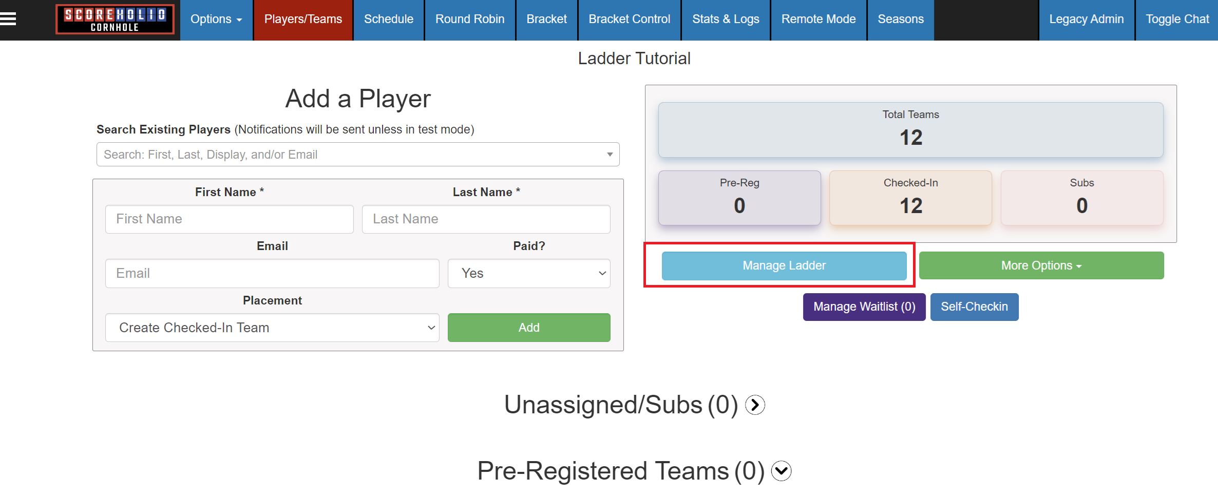 To [add players](https://docs.scoreholio.com/adding-teams) or teams to a Ladder League, head to the **Tournament Admin** section as usual. In the **Players/Teams** tab, add all participants by listing them as either individual players or teams. Then, click on each player or team name to assign an **initial ladder rank**. This rank determines which starting group the players or teams will be placed in, helping to set balanced matchups from the beginning of the league.