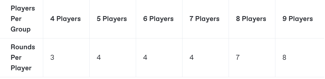 Use the chart below to determine the ideal number of players per group based on the number of rounds you want each player to play: