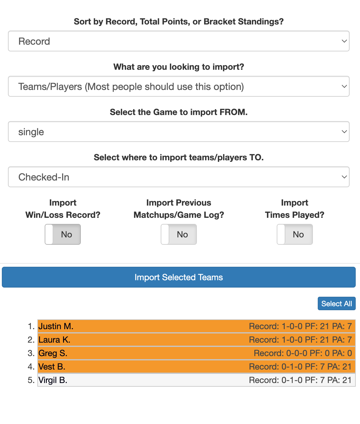 <figure><img src="https://2830358067-files.gitbook.io/~/files/v0/b/gitbook-x-prod.appspot.com/o/spaces%2F-MNzFwCQPtCEArD8DRaL%2Fuploads%2FOXE5R3UADERiR3rG9s4B%2FScreenshot%202024-03-18%20at%209.32.29%20AM.png?alt=media&#x26;token=271f5c8b-40e5-47c4-b1b3-b9fdb31c40ad" alt="" width="375"><figcaption><p>Make sure the players you want in the tournament are highlighted. </p></figcaption></figure>