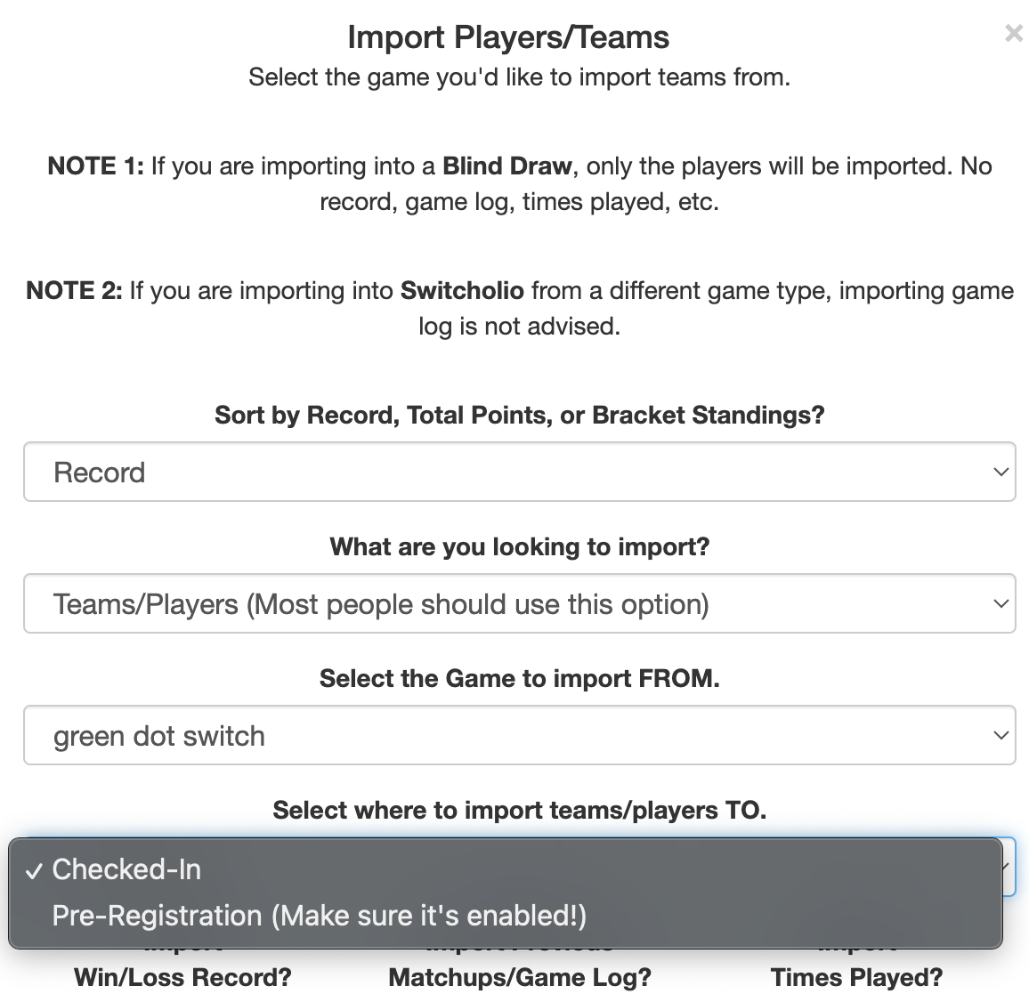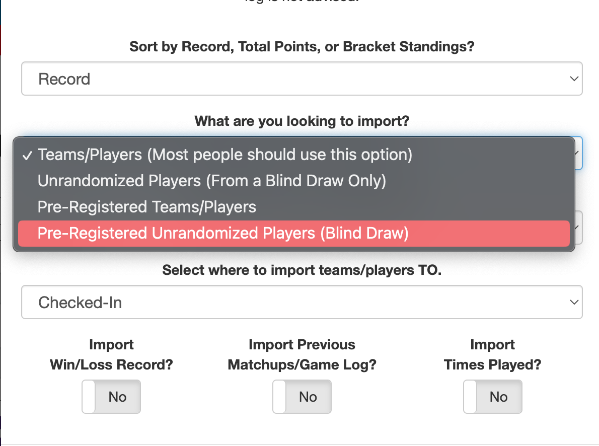 Go into the admin of your tournament, click the “more options” button on the **player tab** in admin. Click the import button. You may need to change the second drop down to “pre-registered players from a blind draw” or something else depending on where you are going to or from.